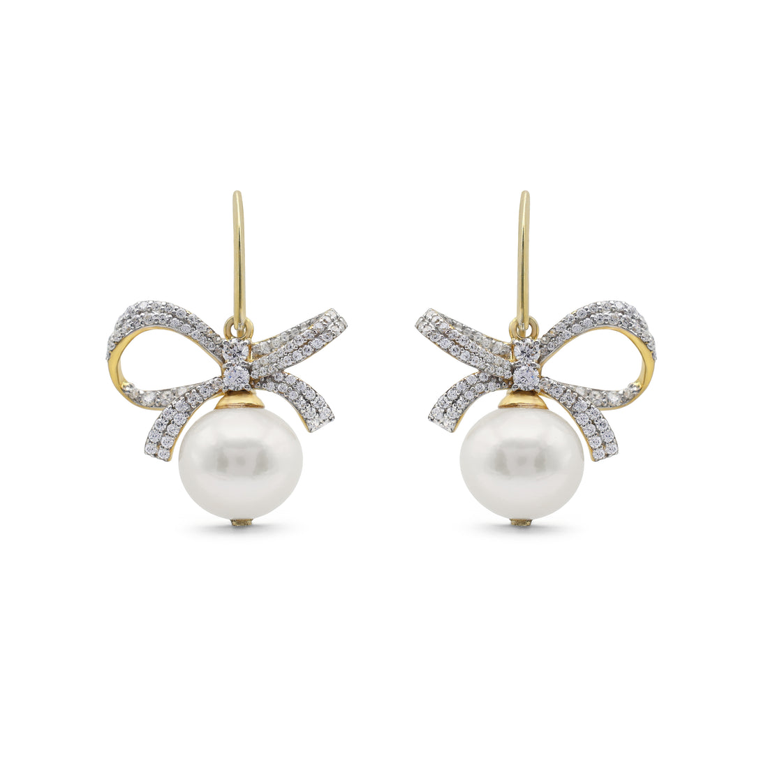 Elegant Pearl & Pavé CZ Bow Drop Earrings in Two-Tone 925 Sterling Silver
