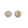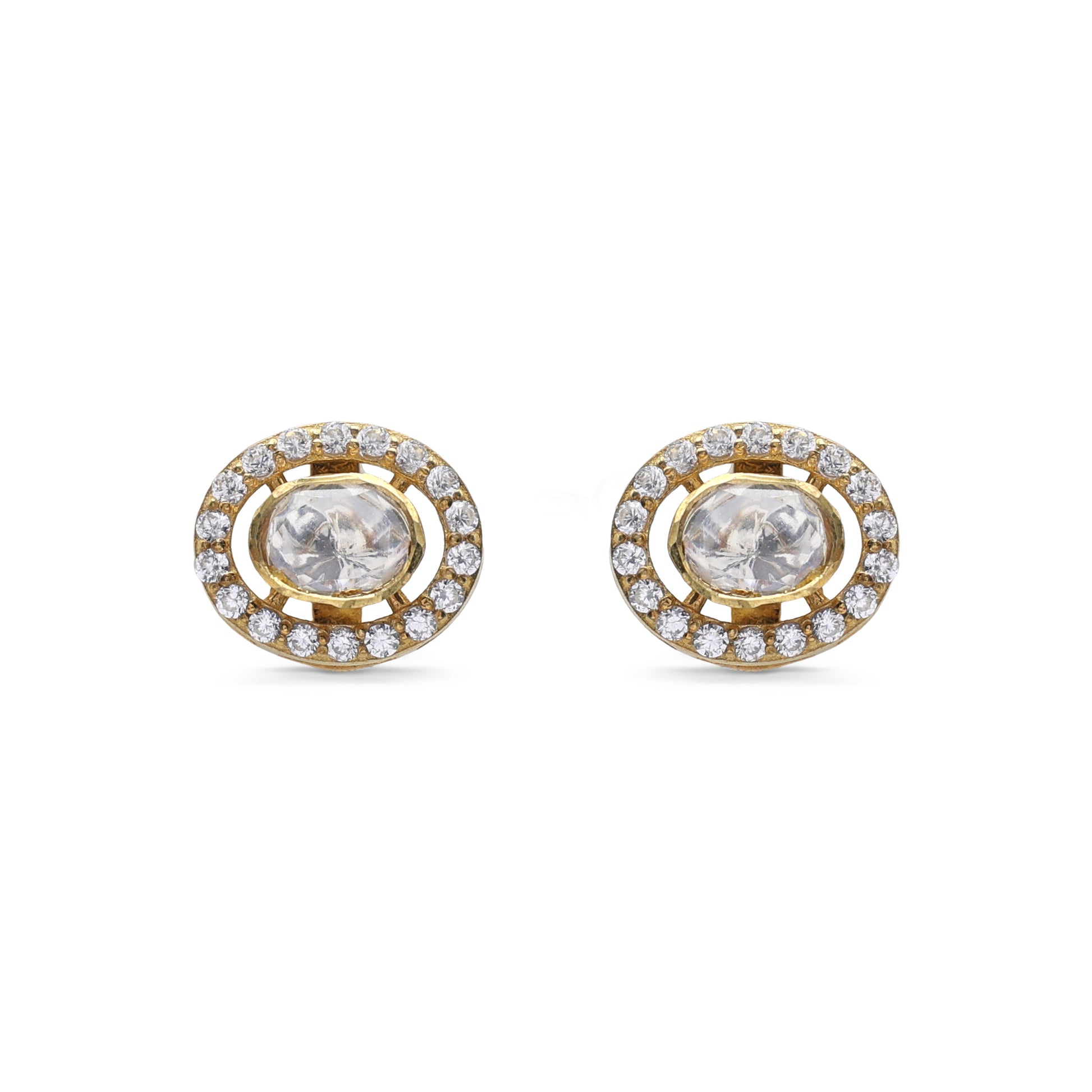 A modern interpretation of heritage design, these stunning stud earrings are both elegant and unique. Each earring features an oval, polki-cut moissanite, celebrated for its organic, glassy lustre and set in a warm, gold-finish bezel. This centerpiece appears to "float" within an open, airy circle, which is then surrounded by a glittering halo of brilliant-cut cubic zirconia. This clever design adds a light, contemporary feel to the traditional Kundan-style. Crafted from 925 sterling silver with a rich gold finish, these studs are perfect for adding a sophisticated, ethnic touch to any ensemble.