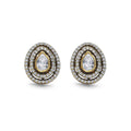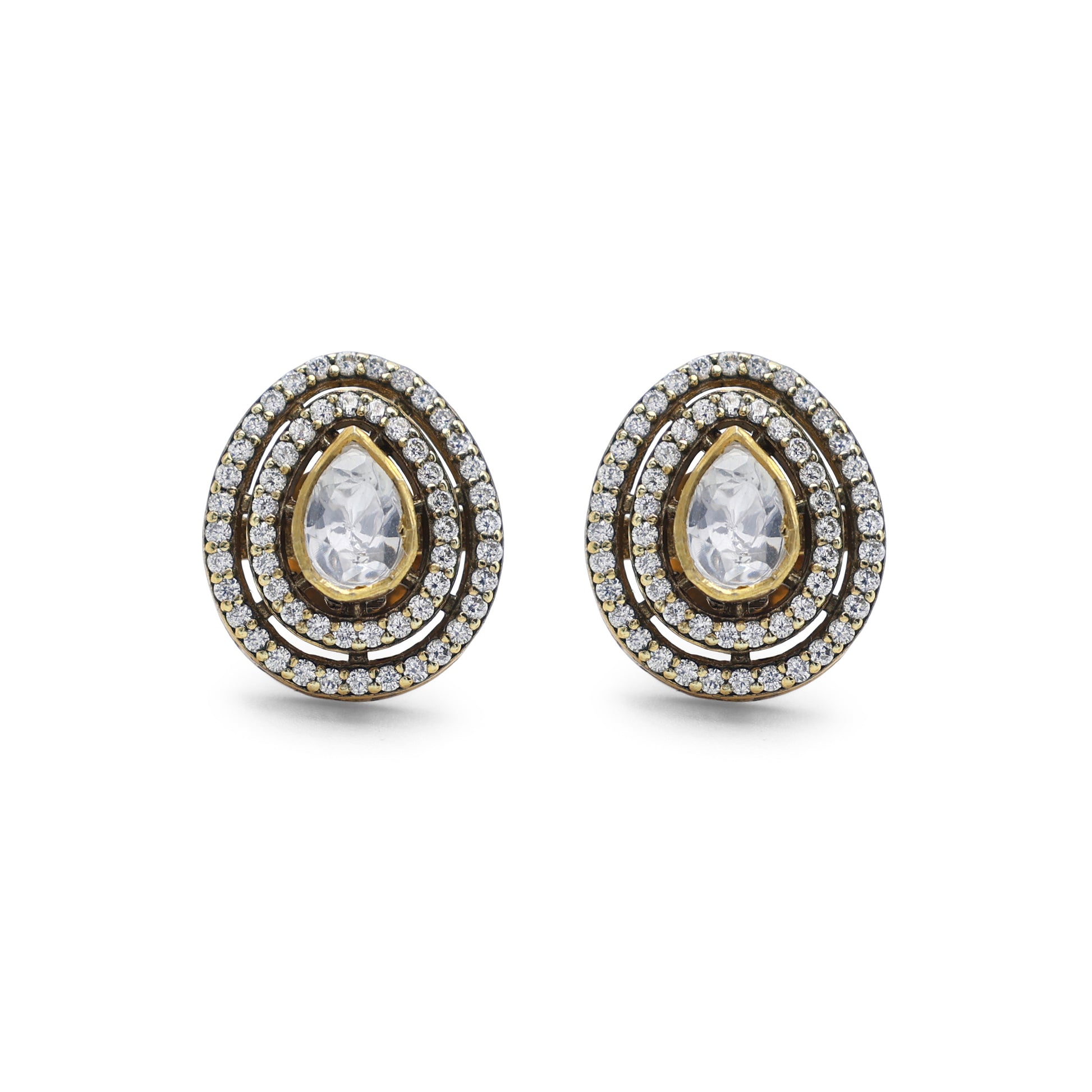 Exuding an air of royal grandeur, these magnificent stud earrings are designed to captivate. At the heart of each piece lies a pear-shaped, polki-cut moissanite, celebrated for its unique, organic lustre and set in a warm, gold-finish bezel. This stunning centerpiece is framed by two concentric oval halos, lavishly pavé-set with brilliant-cut cubic zirconia on a darkened base to maximize their sparkle. Crafted in 925 sterling silver with a secure screw-back design, these earrings offer a dramatic, high-contrast look perfect for weddings, galas, and festive celebrations.