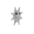 Shine bright with this whimsical and sparkling star brooch. Full of character and charm, this celestial pin is crafted from two-tone 925 sterling silver. The entire piece is lavishly encrusted with a full pavé of brilliant-cut cubic zirconia, creating an intense, diamond-like sparkle. Bringing this adorable star to life are two, bezel-set lab-grown blue sapphires that act as captivating, cartoon-like eyes. This playful and glamorous brooch is perfect for adding a touch of personality and magic to any coat, scarf, or lapel. A delightful gift for any occasion.
