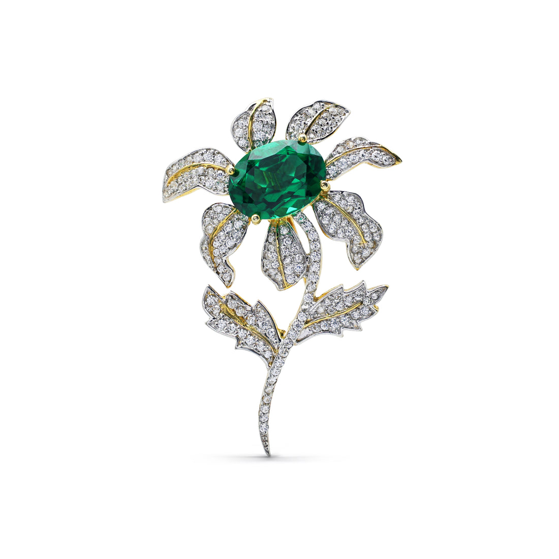 Magnificent Floral Brooch with Oval Lab-Grown Emerald & Pavé CZ in Two-Tone 925 Sterling Silver