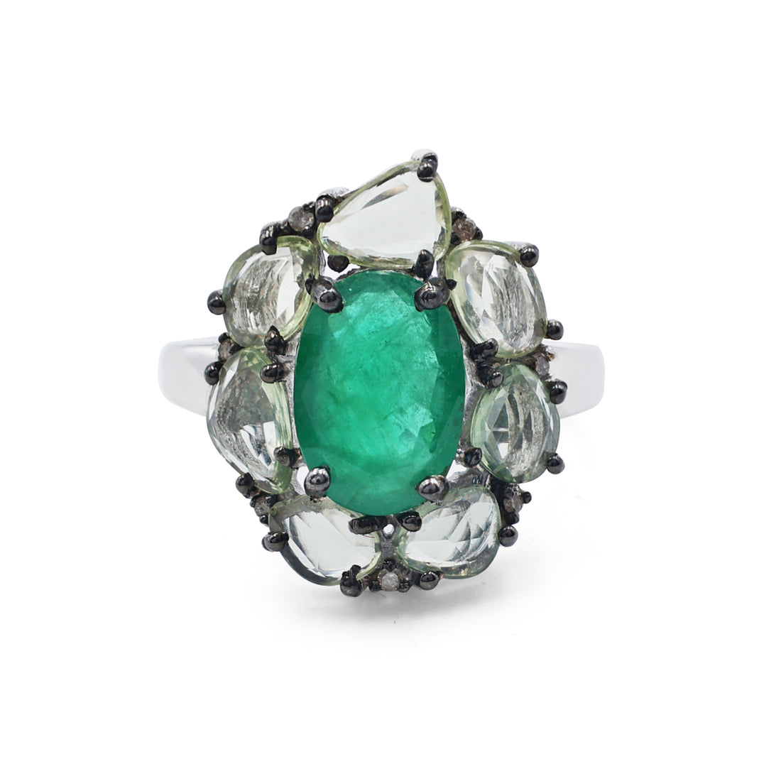 Bold Artisan Cluster Ring with Emerald & Green Sapphire in Black Rhodium Sterling Silver