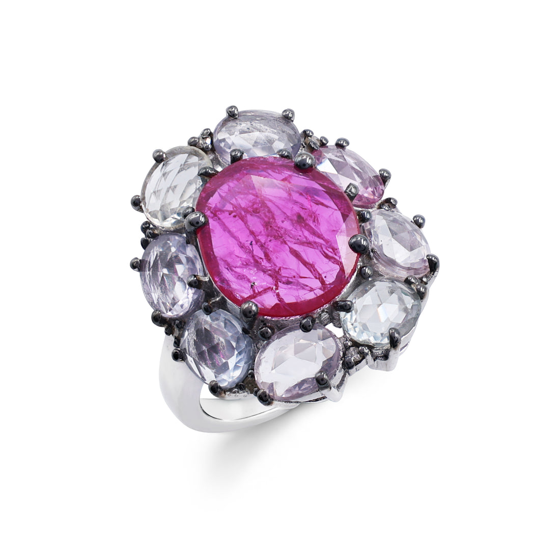 Bold Artisan Cluster Ring with Ruby & Pink Sapphire in Black Rhodium Sterling Silver