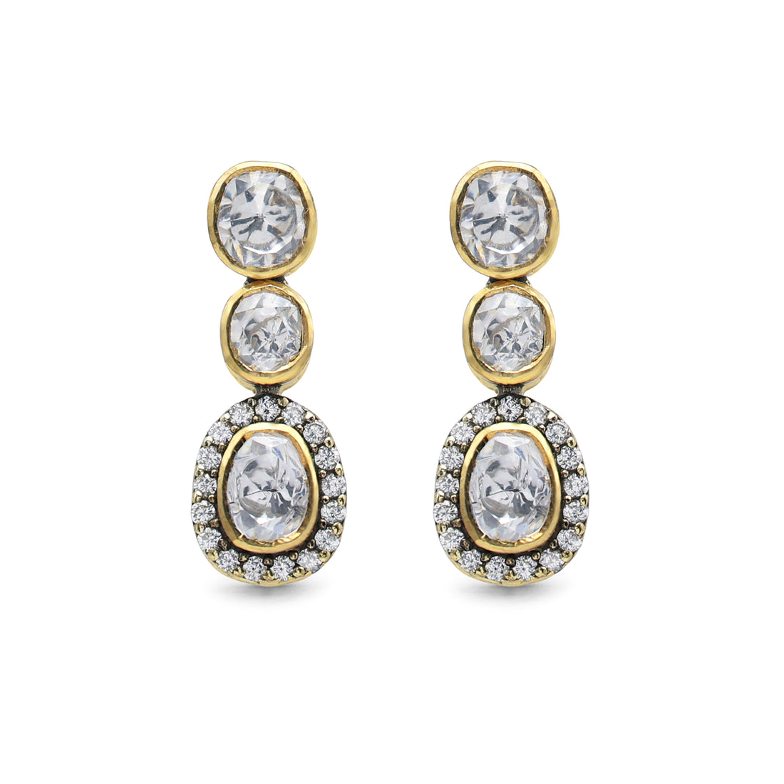 Kundan Style Moissanite Linear Drop Earrings with CZ Halo in Gold Finish 925 Sterling Silver