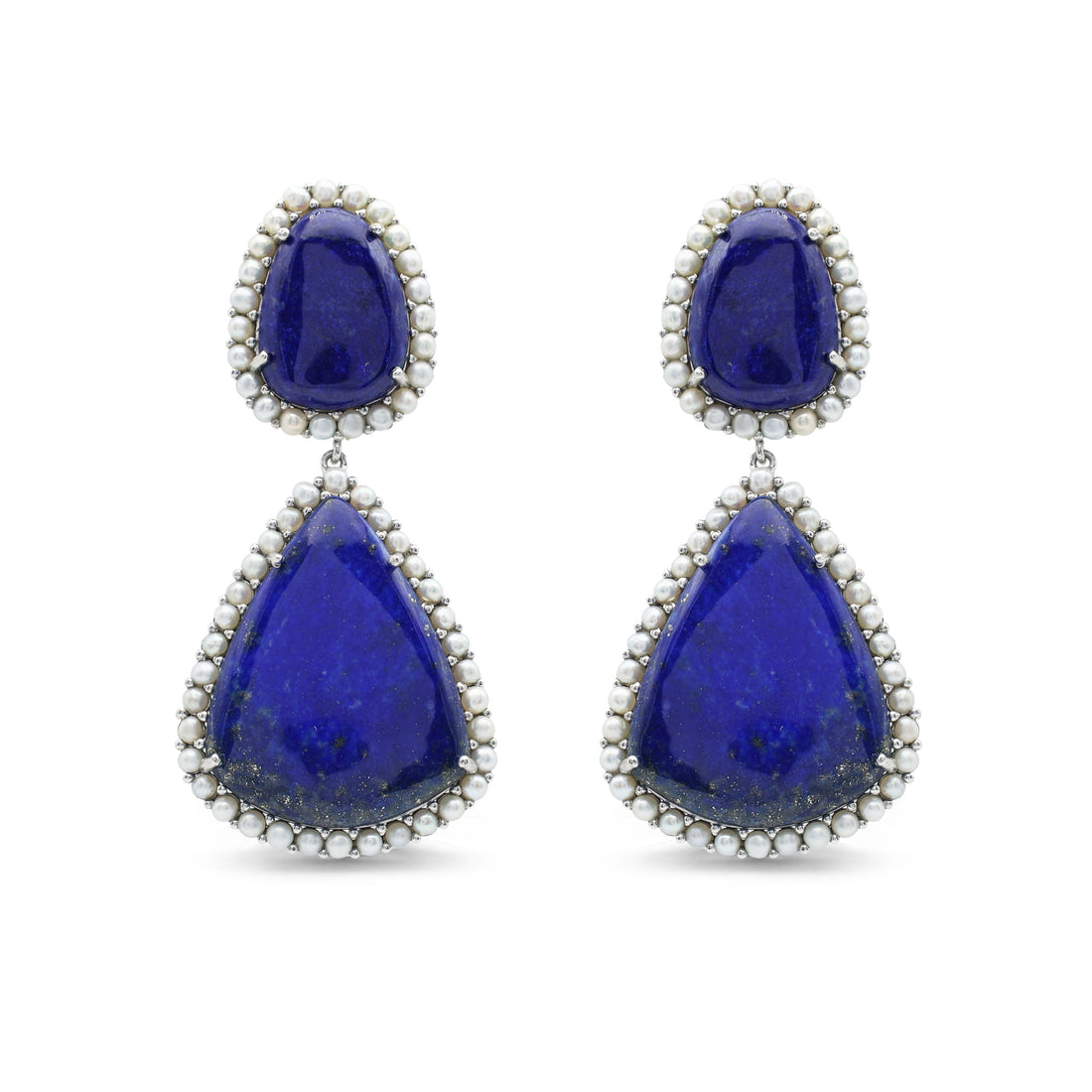 Vintage-Style Lapis Lazuli & Freshwater Pearl Halo Drop Earrings in 925 Sterling Silver