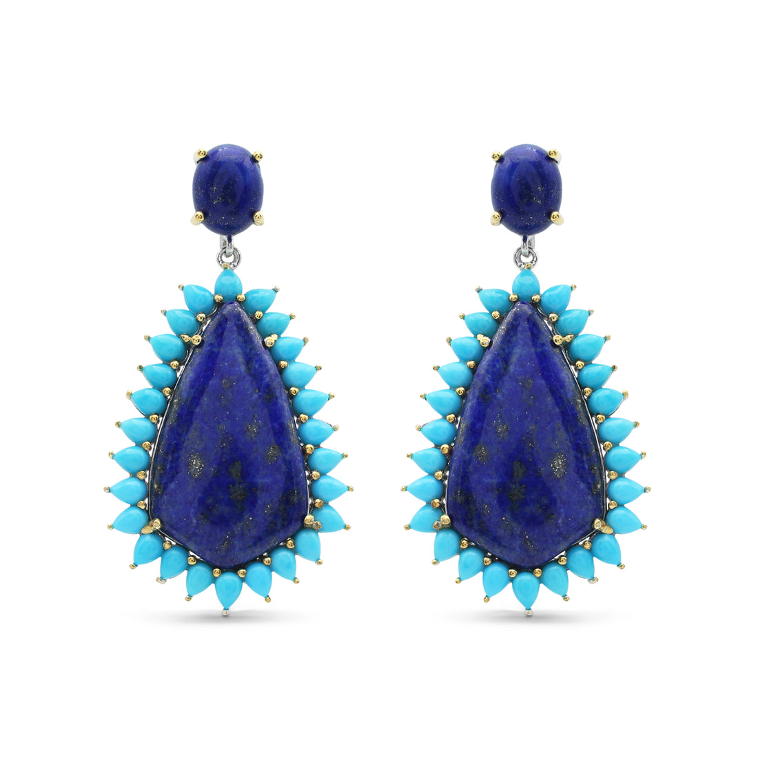 Statement Lapis Lazuli & Turquoise Sunburst Halo Drop Earrings in Two-Tone 925 Sterling Silver