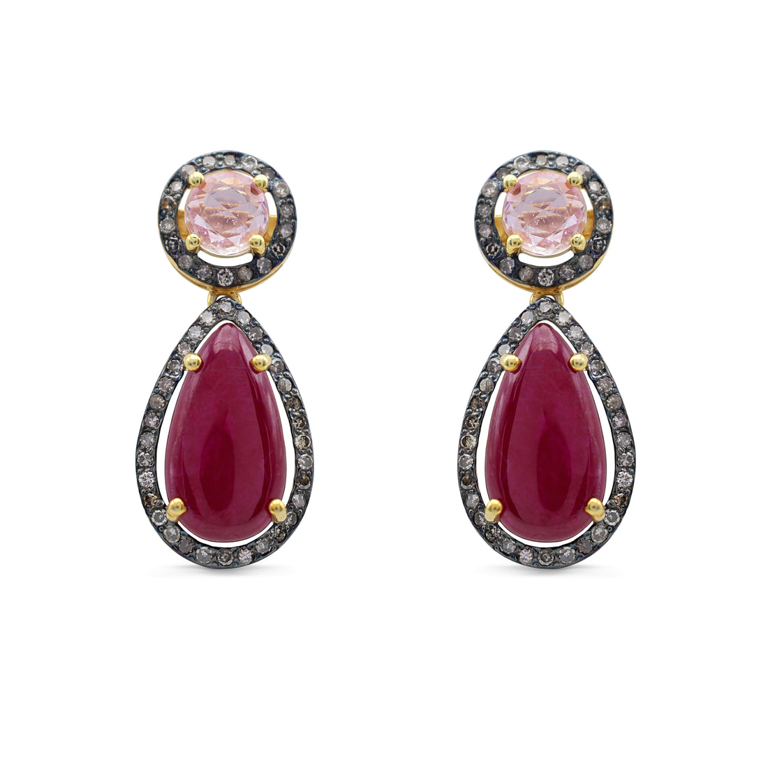 Statement Ruby & Pink Sapphire Drop Earrings with Diamond Halo in Two-Tone Sterling Silver