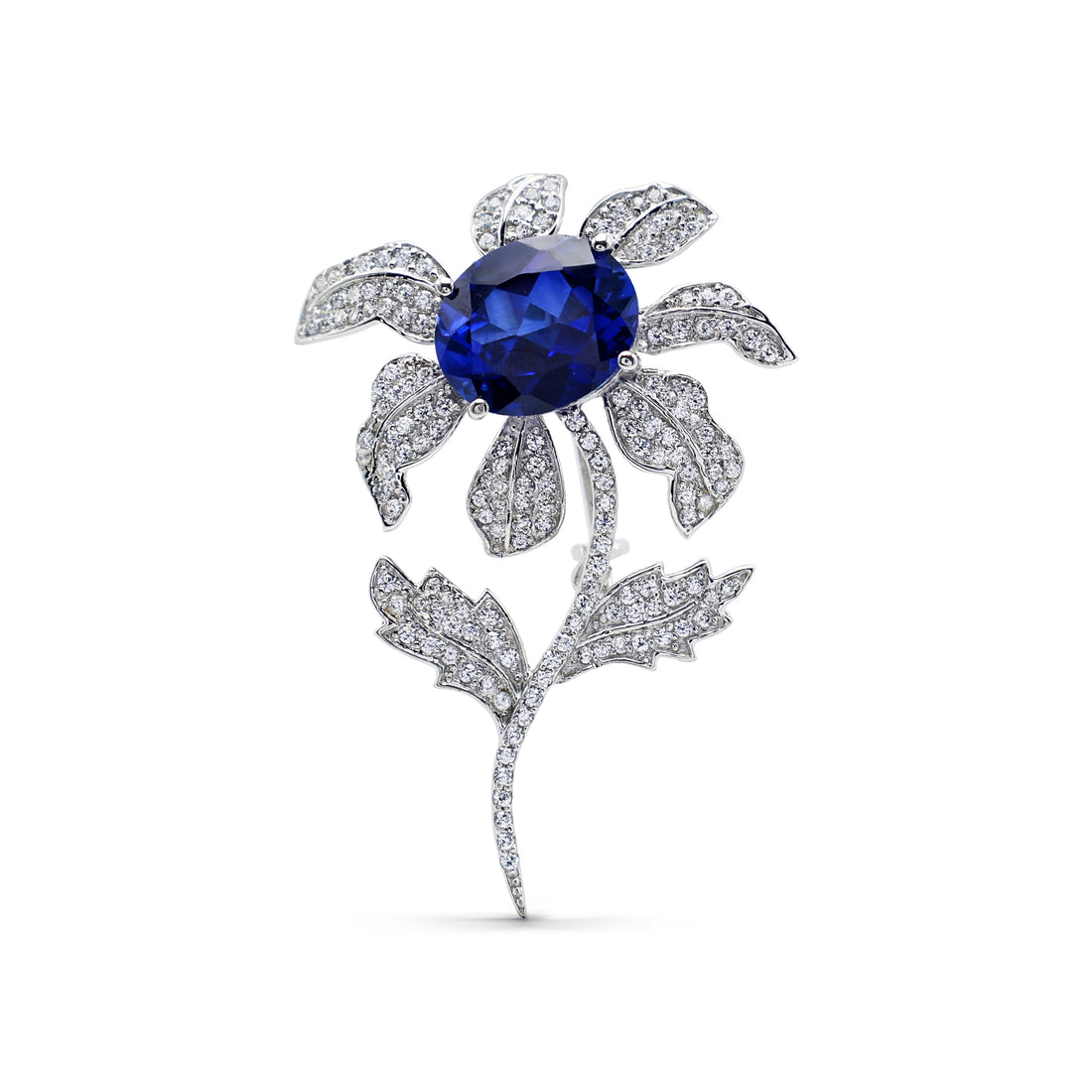 Magnificent Floral Brooch with Lab-Grown Blue Sapphire & Pavé CZ in 925 Sterling Silver