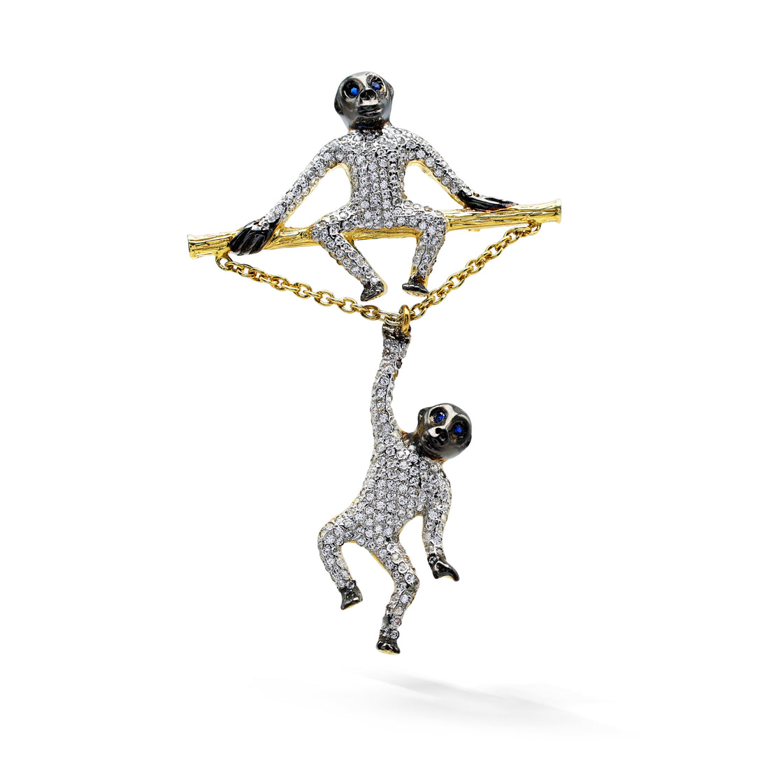 Whimsical Dangle Monkey Brooch with Pavé Cubic Zirconia & Sapphire Eyes in Two-Tone 925 Sterling Silver