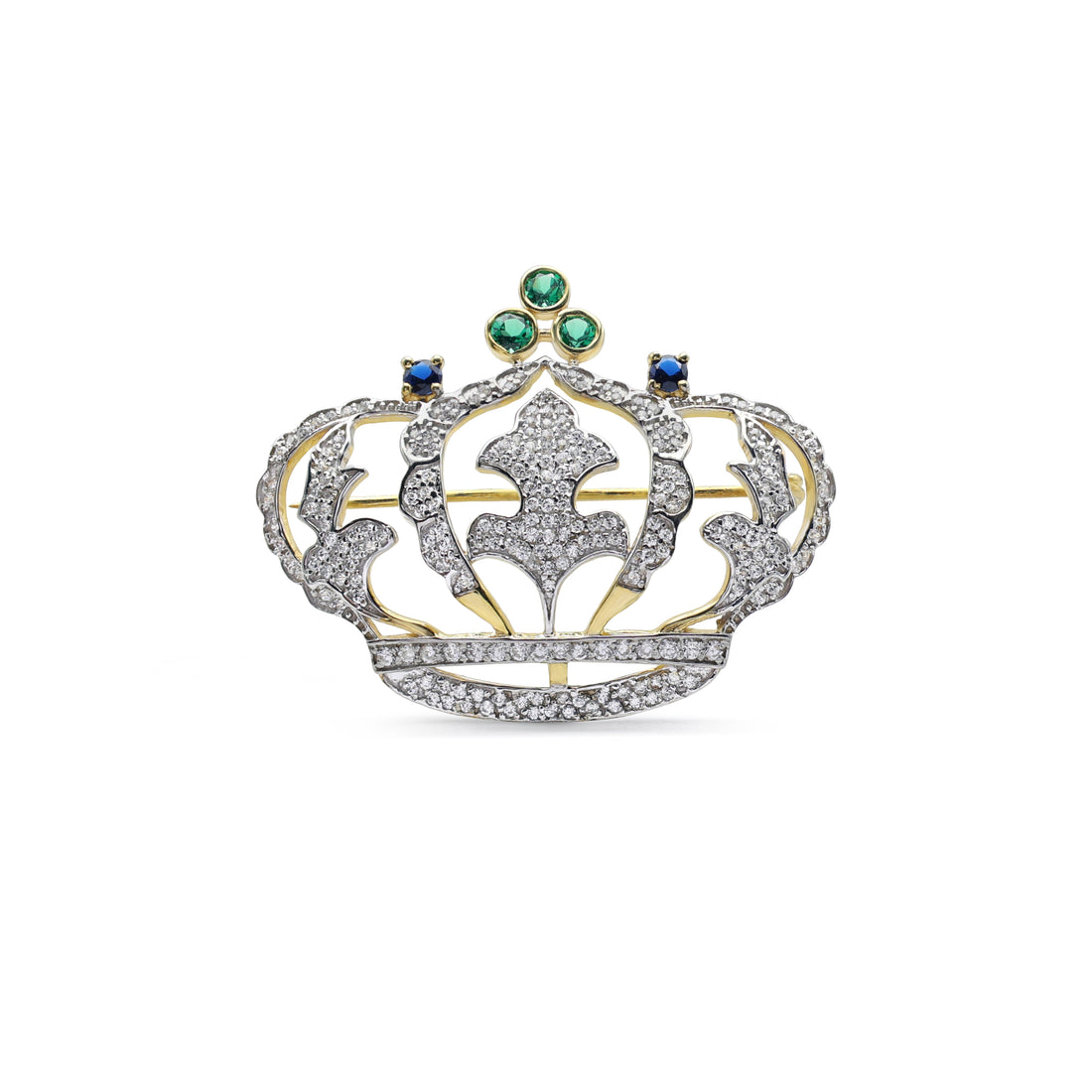 Regal Crown Brooch with Pavé CZ, Lab-Grown Emerald & Sapphire in Two-Tone 925 Sterling Silver