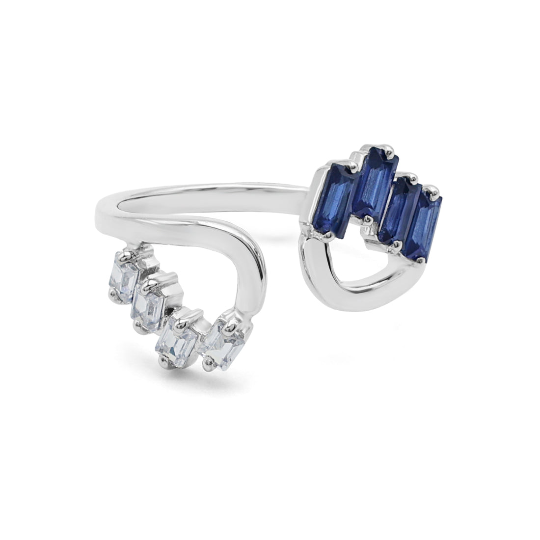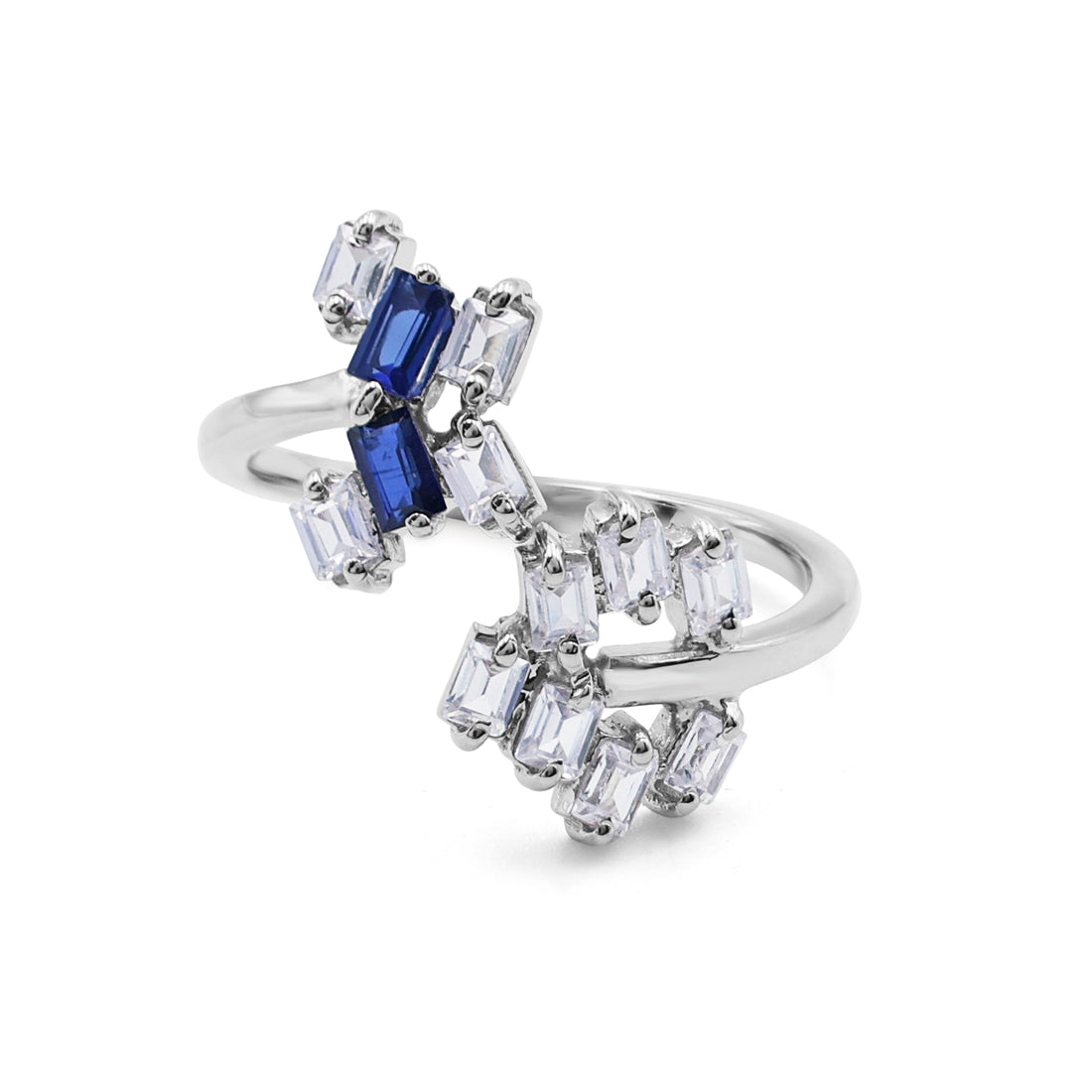 Modern Cluster Bypass Ring with Baguette Lab-Grown Sapphire & CZ in 925 Sterling Silver