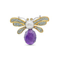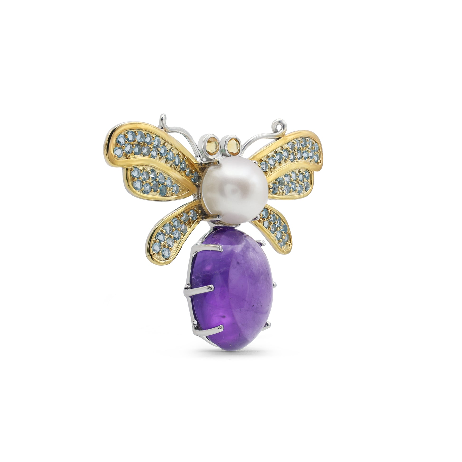 Artisan Amethyst & Pearl Butterfly Brooch with Blue Topaz Wings in Two-Tone 925 Sterling Silver
