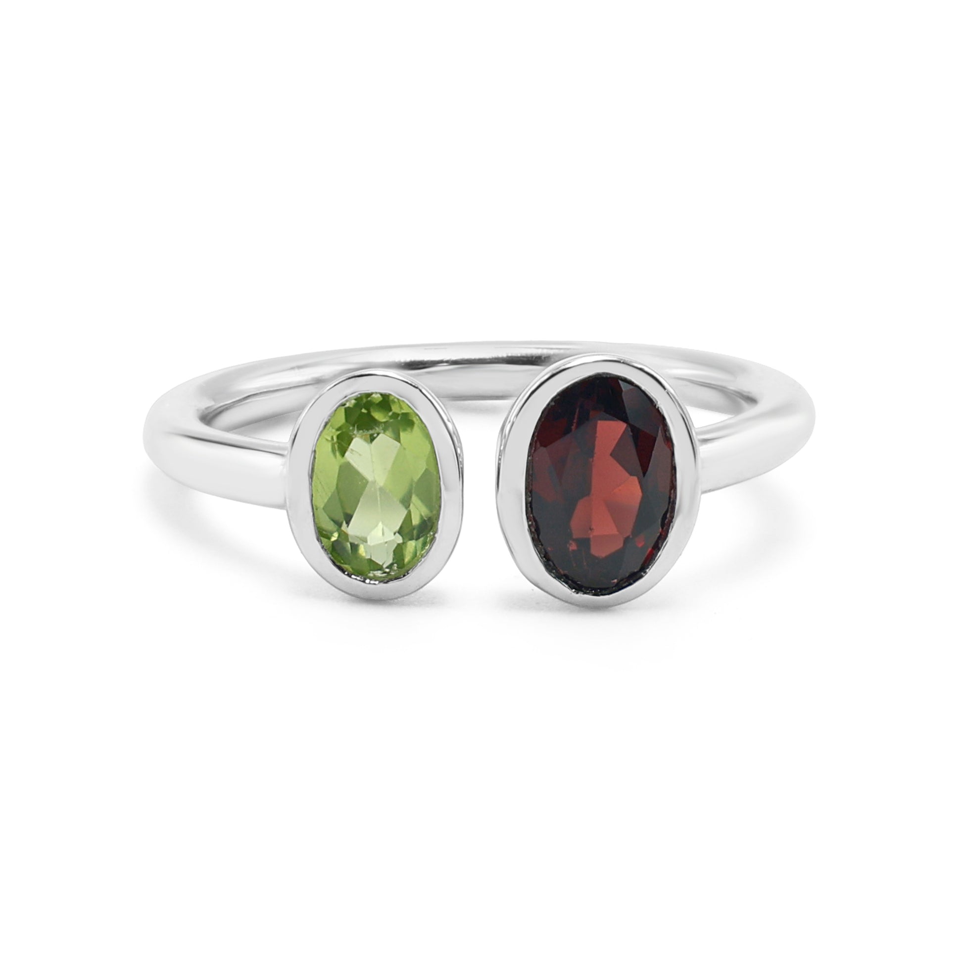 A captivating contrast of vibrant green and deep red, this minimalist ‘Toi et Moi’ ring is a celebration of modern design. Crafted from highly polished 925 sterling silver, the chic open band showcases a zesty, lime-green oval peridot alongside a fiery, wine-red oval garnet. Each gemstone is encased in a sleek and secure bezel setting, which not only protects the stone but also enhances its rich color and clean silhouette. This versatile and sophisticated piece is perfect for everyday wear, adding a bold yet refined pop of color to any outfit.