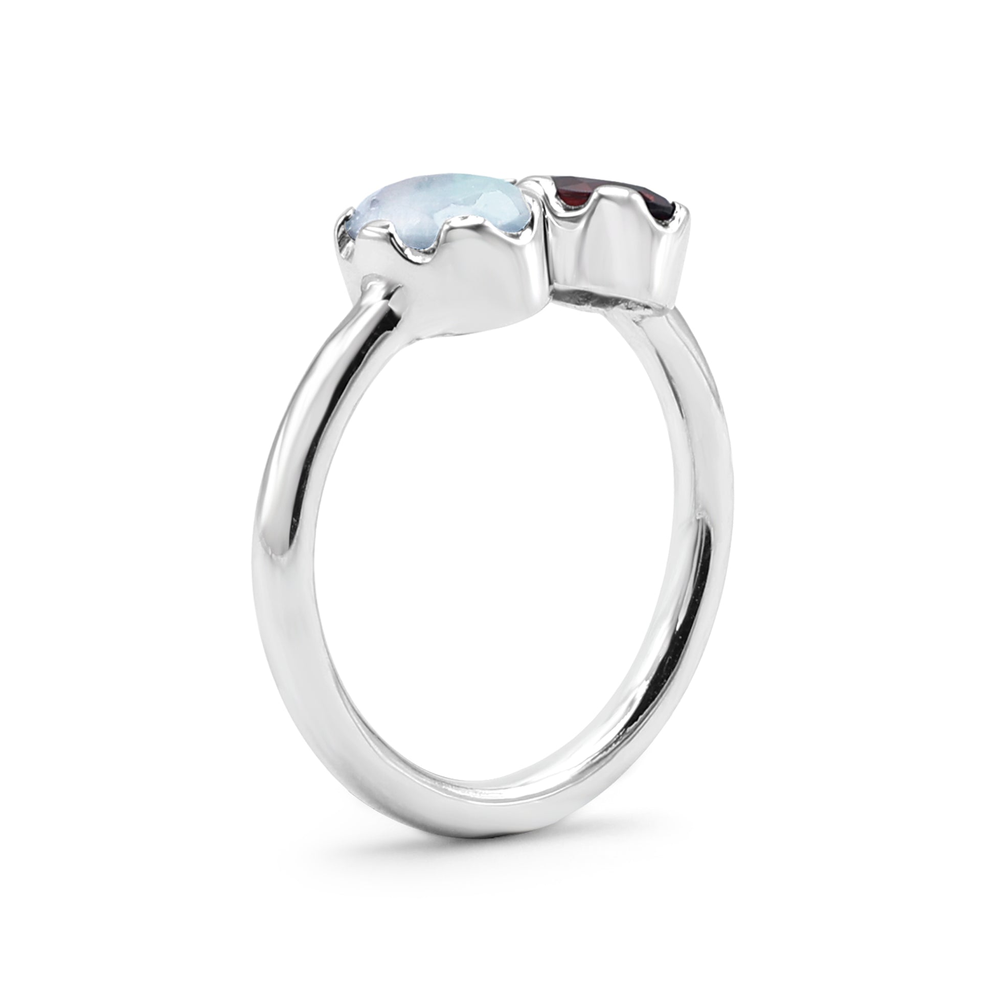 A magical union of fire and light, this enchanting ‘Toi et Moi’ ring pairs the mystical glow of moonstone with the fiery passion of garnet. Crafted from highly polished 925 sterling silver, the elegant open band showcases two captivating oval gemstones. An ethereal rainbow moonstone, cut in a smooth cabochon to reveal its signature blue flash, sits opposite a deep, wine-red faceted garnet that sparkles intensely. Each gem is held within a romantic crown bezel setting, featuring a delicate scalloped edge that adds a touch of vintage, bohemian charm.